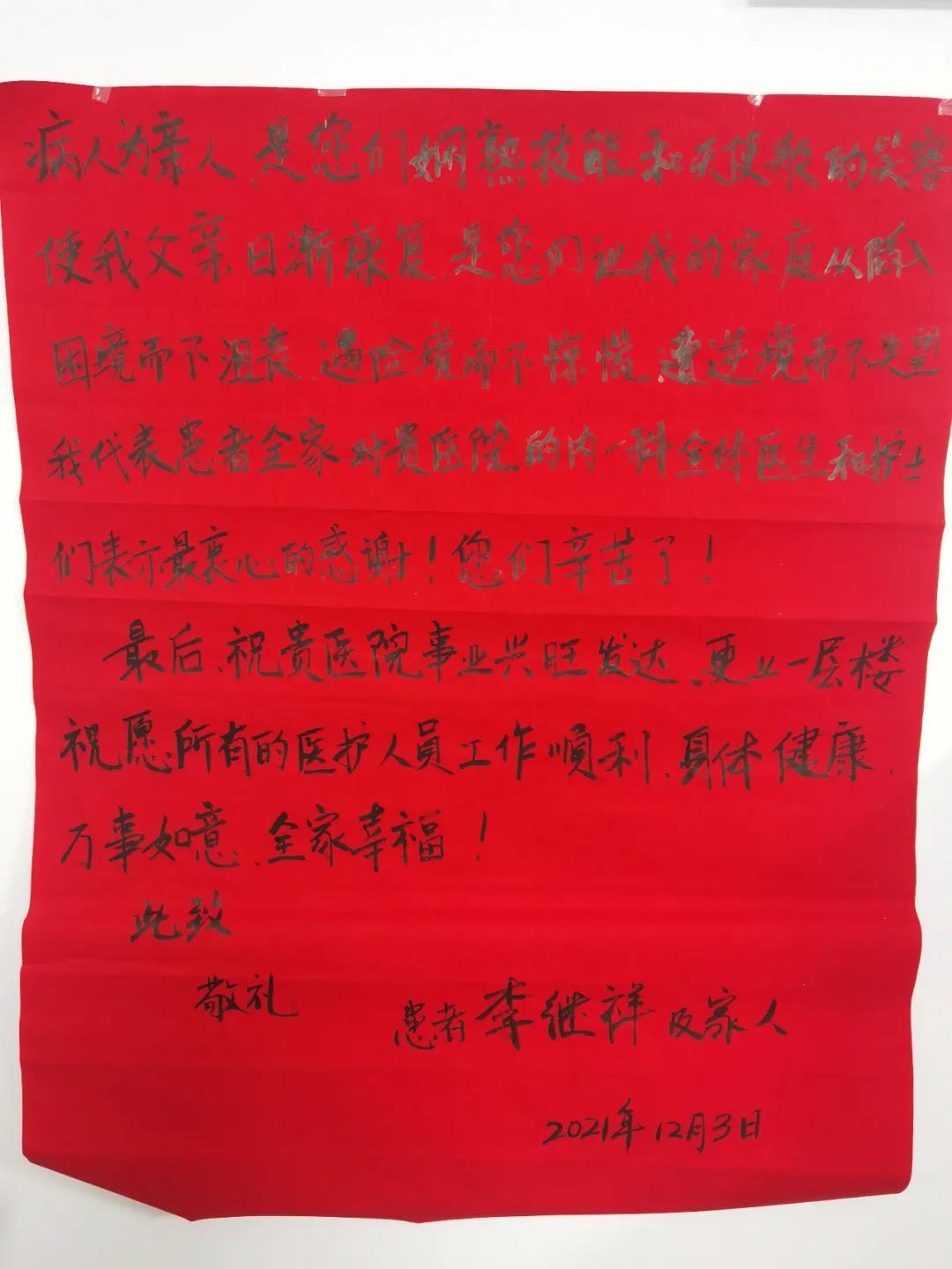 “作为患者家属,一句简单的感谢不足以表达我们的感激之情,很幸运能遇到贵院医术精湛、医德高尚、团结协作、不辞辛劳的的医务人员。”这是近日内一科刚出院的一位患者家属在感谢信中写的话。