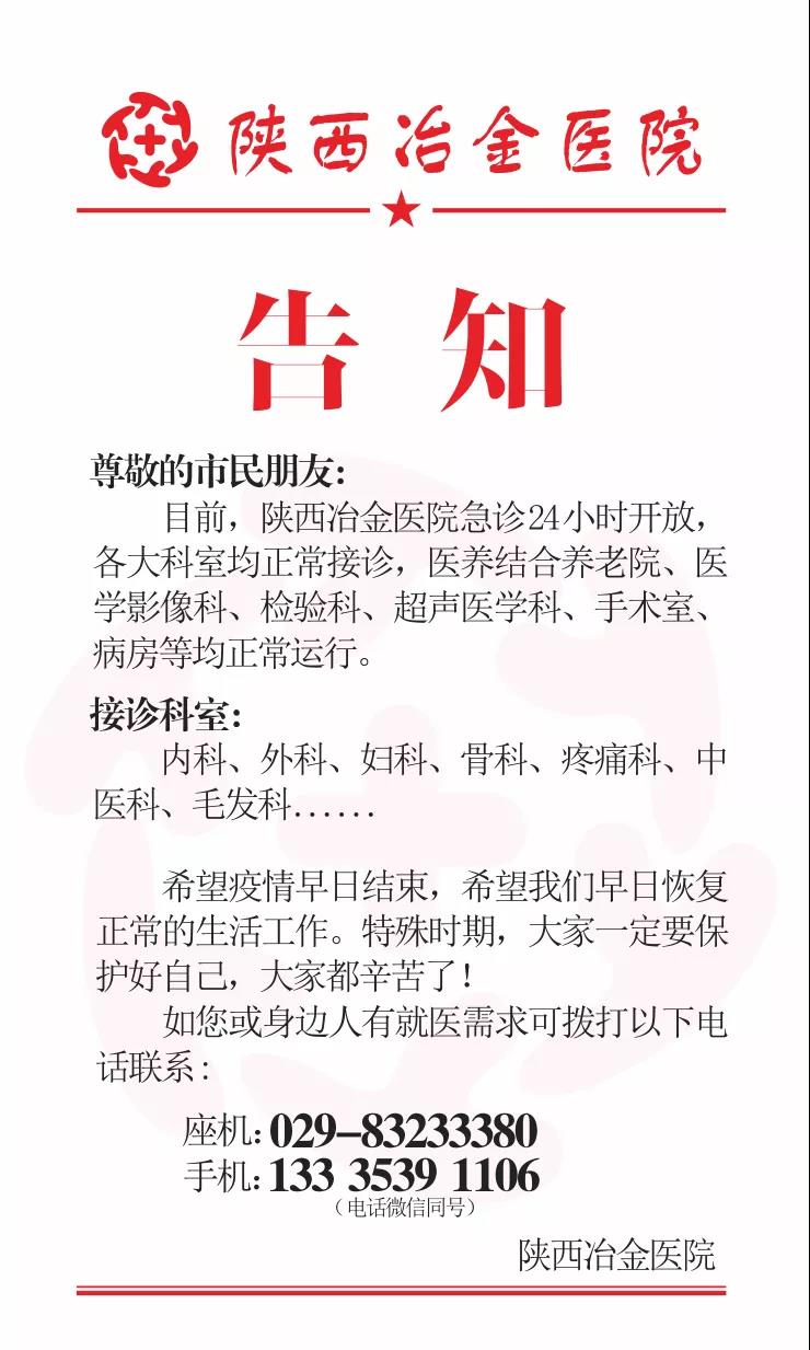 目前,陕西冶金医院急诊24小时开放,各大科室均正常接诊,医养结合养老院、医学影像科、检验科、超声医学科、手术室、病房等均正常运行。接诊科室:内科、外科、妇科、骨科、疼痛科、中医科、毛发科......希望疫情早日结束,希望我们早日恢复正常的生活工作。特殊时期,大家一定要保护好自己,大家都辛苦了!如您或身边人有就医需求,可拨打以下电话联系:029-83233380 13335391106(电话微信同号)