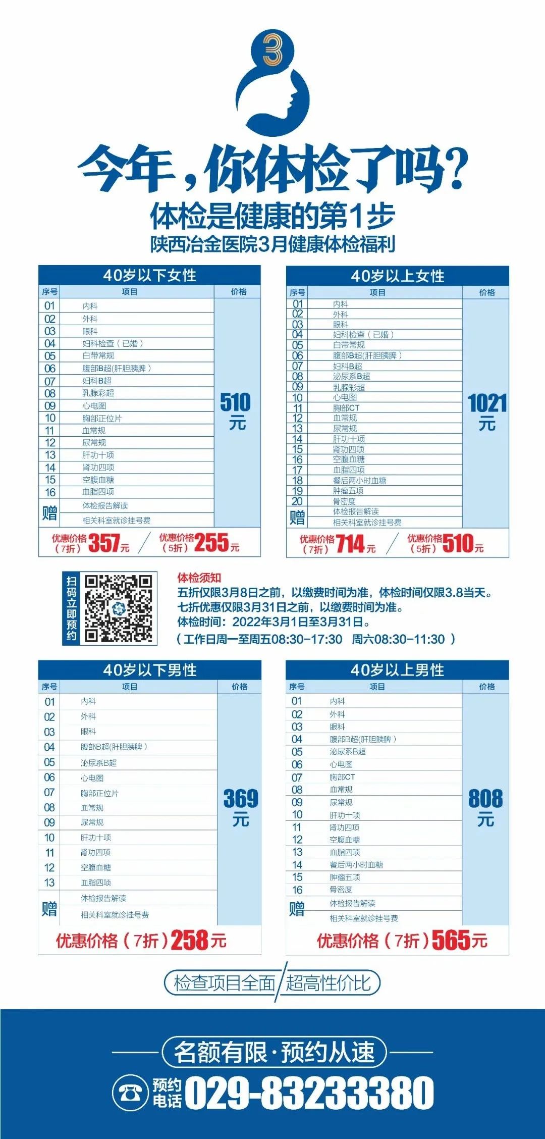 重!磅!消!息丨陕西冶金医院3月体检套餐福利等你来取! 2022-02-28 16:14 健康是幸福生活最重要的指标 健康是1,其他是0 没有1,再多的0也没意义 体检是健康的第1步 陕西冶金医院3月福利 体检套餐特惠等你来 ↓↓↓ *体检须知: 五折仅限3月8日之前,以缴费时间为准,体检时间仅限3.8当天 七折优惠仅限3月31日之前,以缴费时间为准,体检时间2022年3月1日至3月31日 (工作日周一至周五08:30-17:30,周六08:30-11:30)