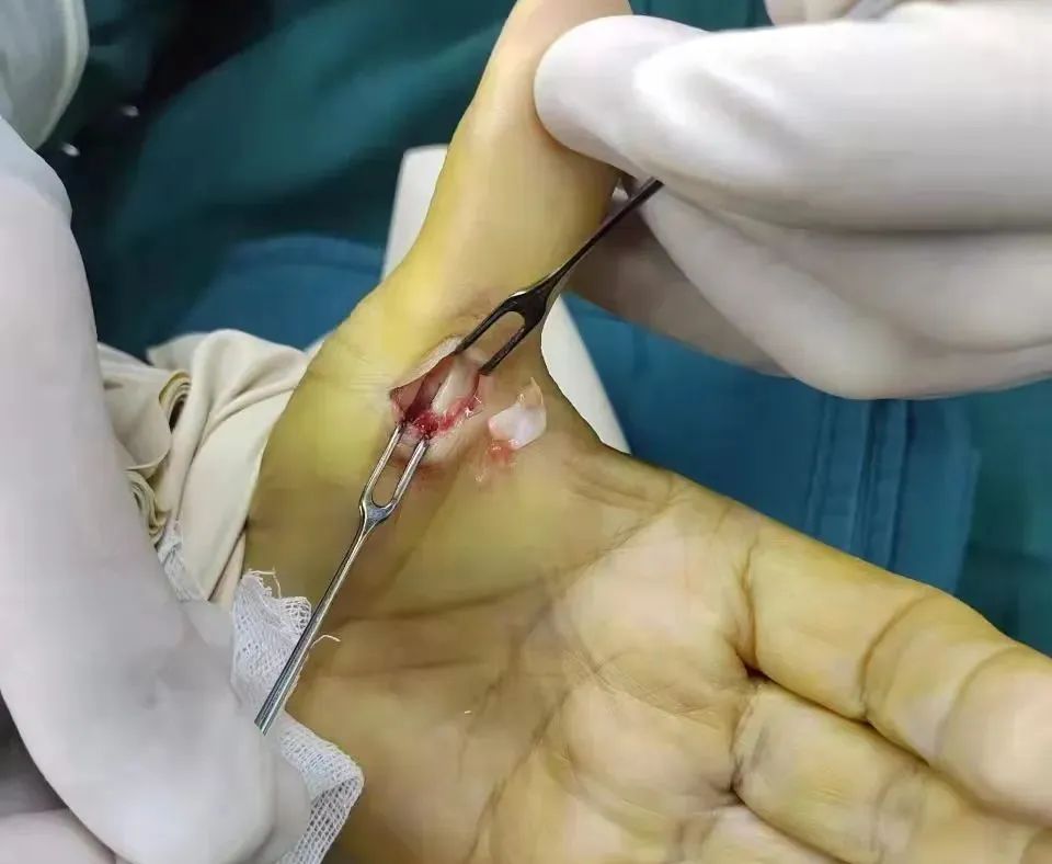 在局部麻醉下进行左拇指狭窄性腱鞘炎松解术,术中见屈肌腱炎性结节于掌指关节处卡顿,局部腱鞘增厚,屈肌腱粘连紧密,纵行切口腱鞘,松解粘连的肌腱。