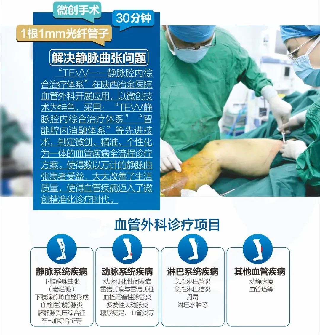 陕西冶金医院引进的“TEVV静脉腔内综合治疗体系”,是一种从体表不同区域通过血管路径所进行的微创手术。