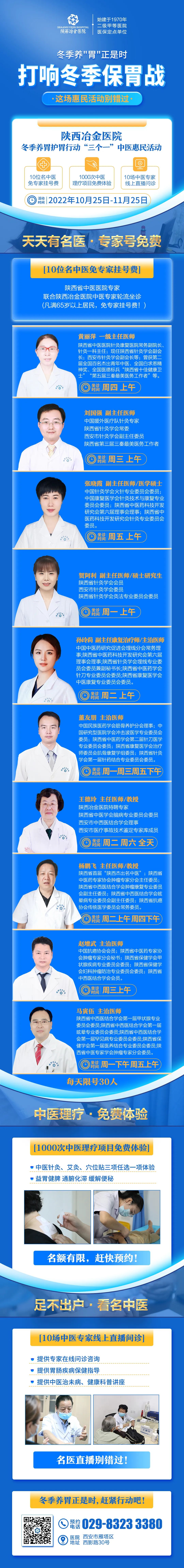 惠民活动丨陕西冶金医院冬季养胃行动,正在继续... 2022-11-13 17:08 「陕西冶金医院冬季养胃行动」 “三个一”中医惠民活动 正在继续 ☑ 10位 名中医免专家挂号费 ☑ 1000次 中医理疗免费体验 ☑ 10场 中医专家线上直播问诊 活动时间:10月25日-11月25日