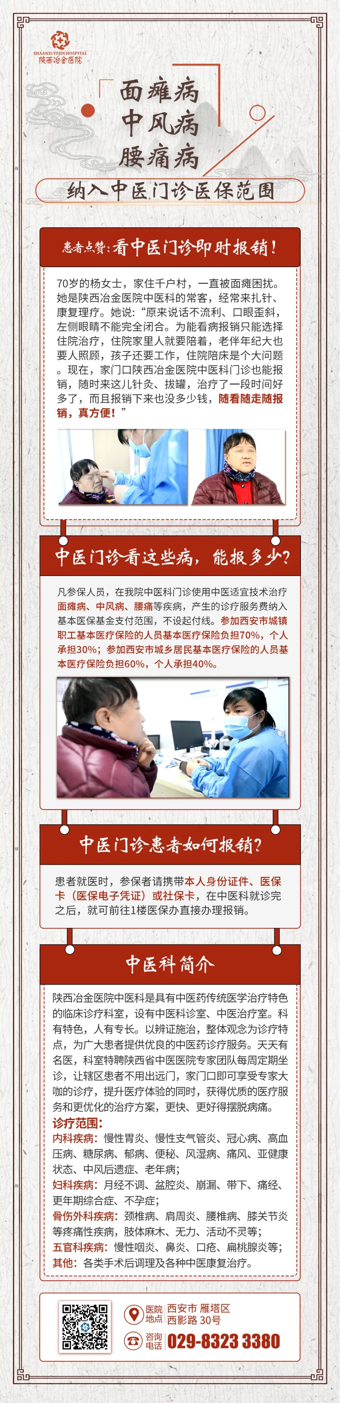 她说:“原来面瘫说话不流利、口眼歪斜,右侧眼睛不能完全闭合。为能看病报销只能选择住院治疗,住院家里人就要陪着,老伴年纪大也要人照顾,孩子还要工作,住院陪床是个大问题。现在,家门口陕西冶金医院中医科门诊也能报销,随时来这儿针灸、拔罐,治疗了一段时间好多了,而且报销下来也没多少钱,随看随走随报销,真方便!”