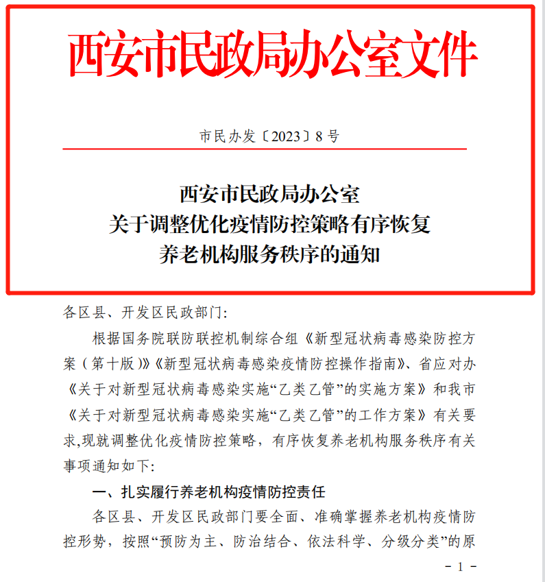 西安市第一爱心护理院(陕西冶金养老院)根据《西安市民政局办公室关于调整优化疫情防控策略有序恢复养老机构服务秩序的通知》要求,结合院内实际,开始安全有序恢复养老服务秩序。