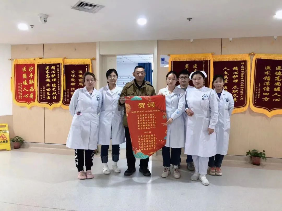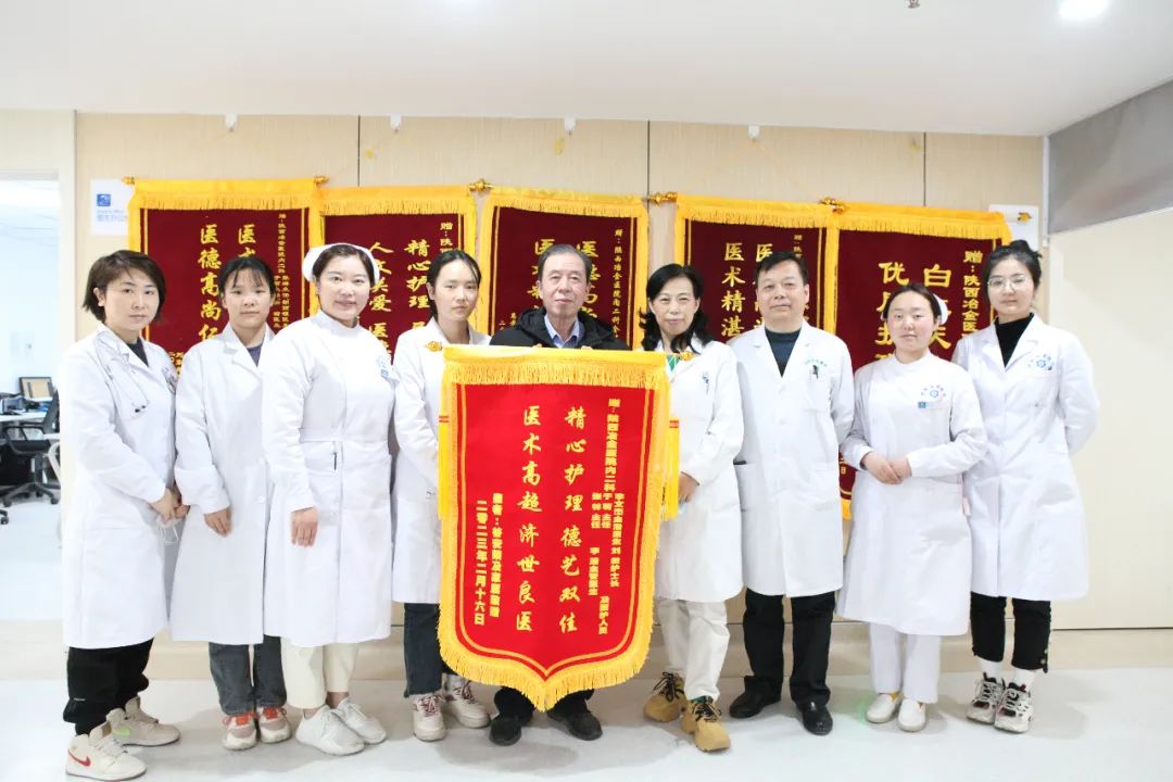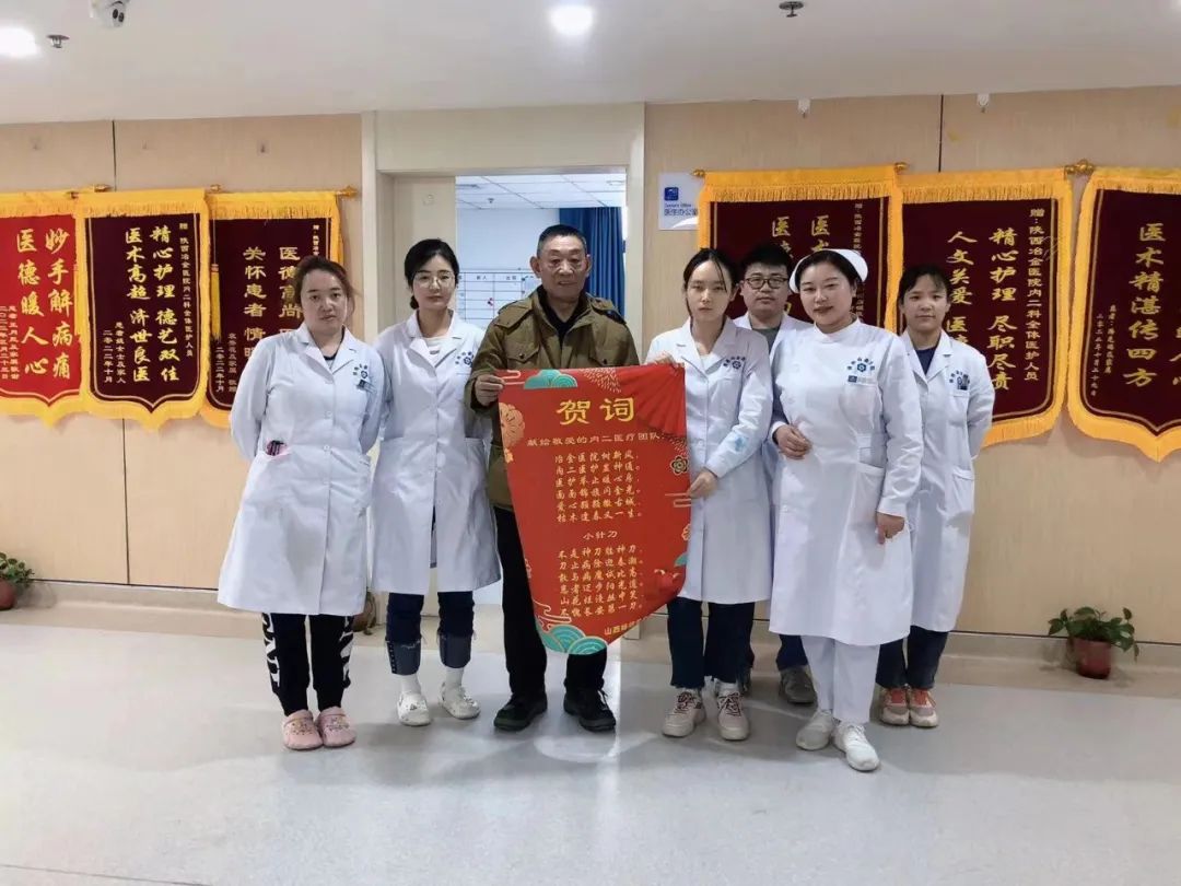 2月15日,患者将一面印有“精心护理德艺双馨,医术高超济世良医”的锦旗送到了陕西冶金医院内二科,表达了对科室全体医护人员的无尽感激之情,真挚的感谢特聘专家张琳、于萌主任、李文杰医生及内二科全体医护人员在住院期间对他的精心治疗、健康指导和优质服务。