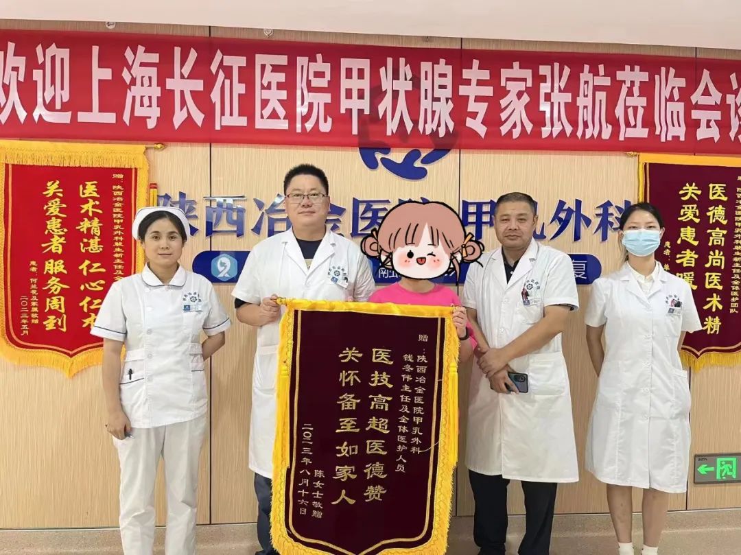 患者小陈,16岁,甲亢半年余,当地医院给予口服药物效果不佳,病情反复,后在陕西冶金医院甲乳外科钱主任处就诊。临床给予甲亢微创减融术,康复出院后,复查小陈指标下降,心率也恢复正常。小陈及家属对微创消融技术非常认可,特送锦旗对钱主任和甲乳外科全体医护人员表示感谢。