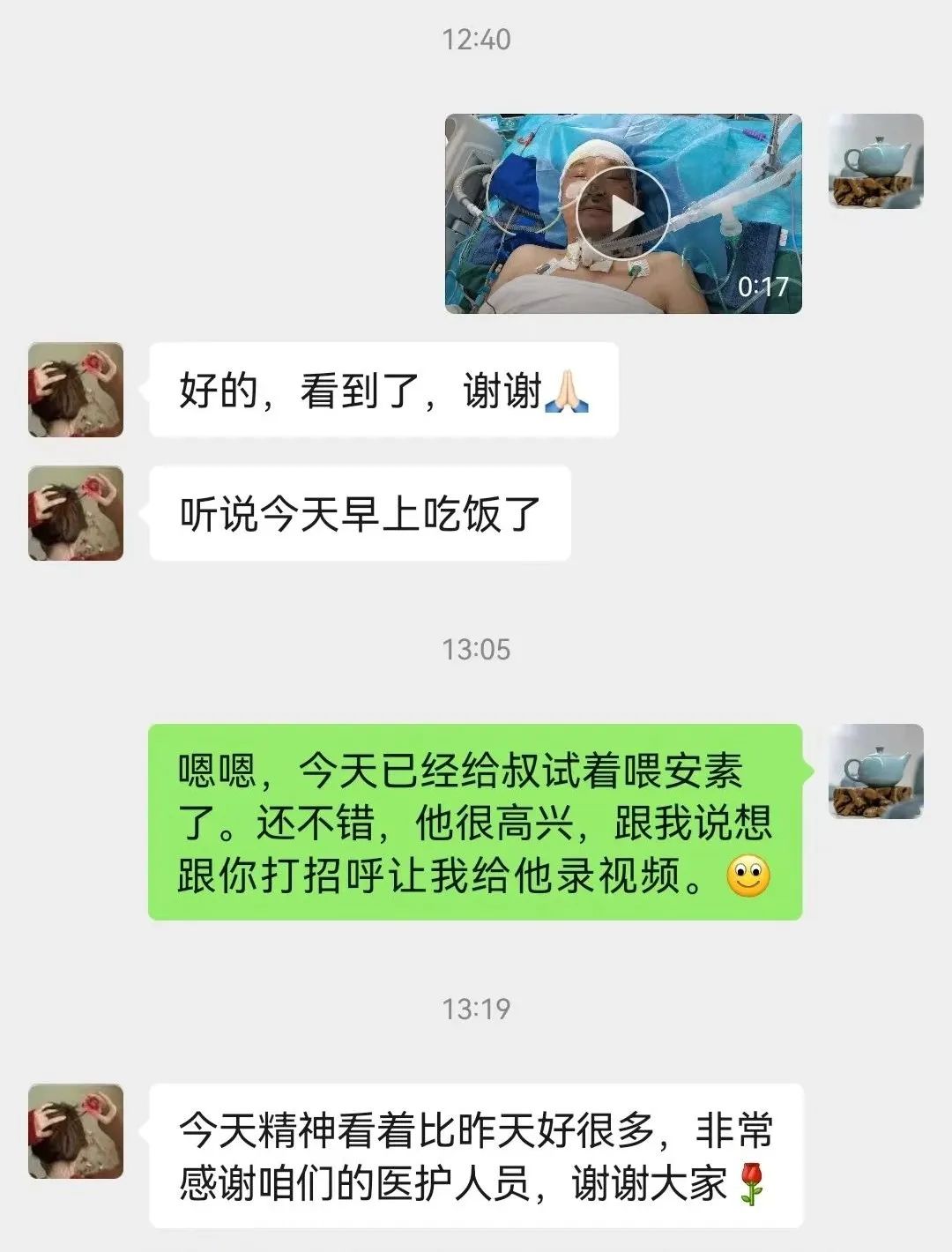 在重症医学科医护团队治疗和护理下王先生恢复良好,开颅术后第10天,各项指标平稳,拆除头部伤口敷料,拔出气管插管后患者的第一句话是:谢谢。