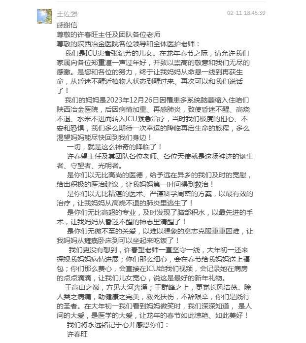 我们是ICU患者张纪芳的儿女。在龙年春节之际,请允许我们家属向各位郑重道一声过年好,并致以崇高的敬意和我们无尽感激。是您和各位的努力,终于让我妈妈从命悬一线到再获生命,从昏迷不醒近植物人状态到醒过来再次可以和我们说话了!
