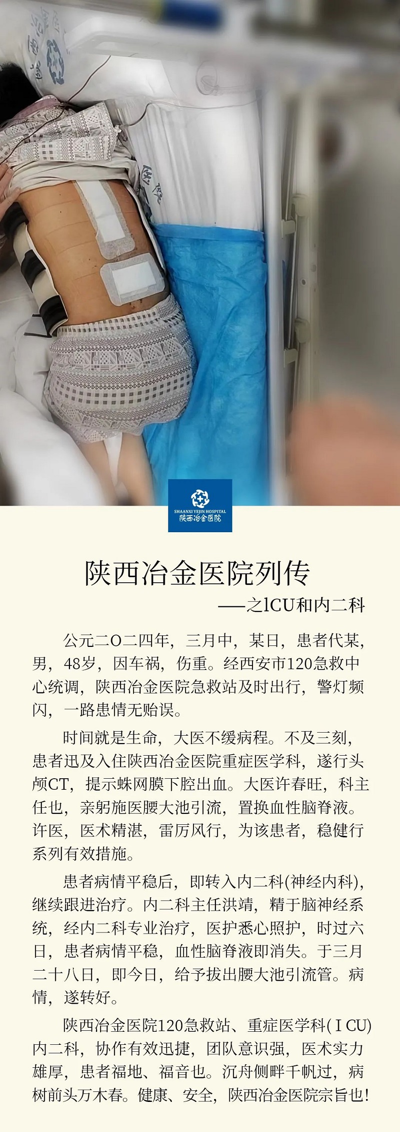 陕西冶金医院120急救站、重症医学科(ⅠCU)、内二科,协作有效迅捷,团队意识强,医术实力雄厚,患者福地、福音也。沉舟侧畔千帆过,病树前头万木春。健康、安全,陕西冶金医院宗旨也!